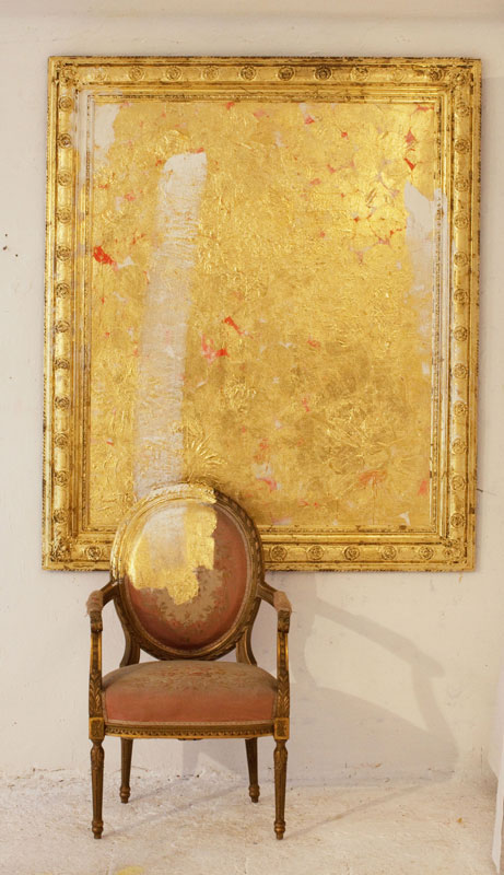 2-teilig, Öl, blattgold, Leinwand, vergoldeter alter Vollholzrahmen, Stuhlobjekt, teilweise bemalt und vergoldet, 176 x 150cm